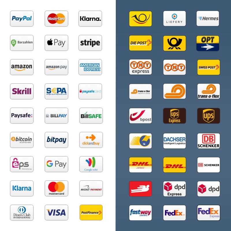 Ich habe keine Kosten und Mühen gescheut, dir ein praktisches Bundle aus allen möglichen Zahlungs- und Versandlogos zu erstellen. Das Paket beinhaltet über 200 Icons, allesamt einheitlich und jeweils als PNG und SVG.